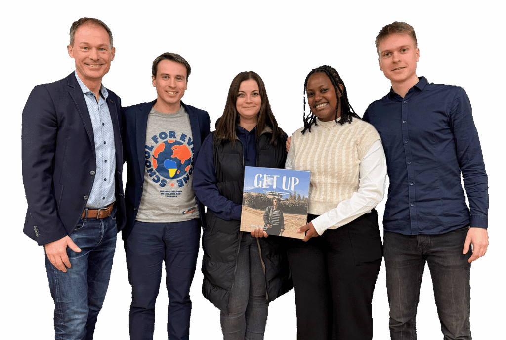 Roman Klawun, Malte Schüler (Grafik), Nadine Boese (Citylauf e.V.), Anastazia Mgonellah (Arusha) und Espen Göcke (Fotos) stellen „GET UP“ im März 2025 in Rostock vor